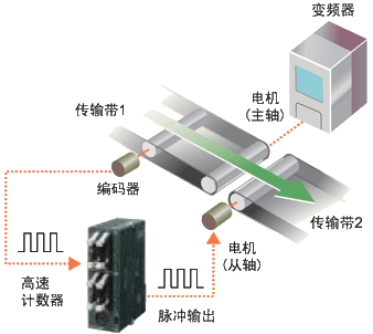 如上圖所示,通過(guò)編碼器脈沖計(jì)數(shù)來(lái)測(cè)量變頻器所控制的傳輸帶1的速度,并使電機(jī)(從軸)輸出與該速度相符的脈沖(JOG運(yùn)行),使得傳輸帶2的速度實(shí)現(xiàn)同步。